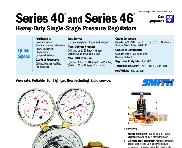 The Smith 40-50-510 is a premium heavy-duty single-stage regulator designed to meet the rigorous demands of professional welding, cutting, and heating applications. Optimized for high-flow performance, this Series 40 regulator is capable of producing flows over 16,000 SCFH, which is up to 25% higher than comparable heavy-duty competitors. This exceptional flow capacity ensures stable flame characteristics and consistent pressure delivery, essential for maintaining cut quality and weld integrity during intensive operations. The unit provides extremely accurate outlet pressure, maintaining within ±2% of the actual gauge reading, ensuring that your torch receives the exact pressure required for the job.