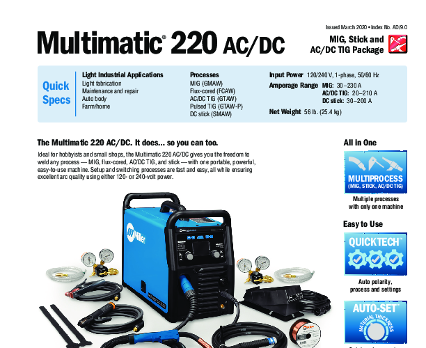 All in One: Take on more projects with one machine that has MIG, Stick, AC and DC TIG. QuickTech™: Automatically determines the polarity. MIG gun and TIG torch can stay connected at the same time. Automatically switches to the right process. Just hit the trigger or the foot control and the machine automatically changes. Automatically recalls the settings from the last process used. Multi-Voltage Plug (MVP): Allows for connection to 120- or 240-volt receptacles without tools. Choose the plug that fits the receptacle and connect it to the power cord. Auto-Set™ Elite: offers predefined weld settings to increase ease of use and ensure that the job is done right for operators of all skill levels. Pro-Set™ Feature: Eliminates the guesswork when setting weld parameters. Simply adjust control until Pro-Set™ appears on the display and the number turns blue. Available for AC Balance and Frequency (TIG), DC Pulse (TIG), and DIG (Stick). 14-Pin Controlled Operator Alternatives: The standard 14-pin connector lets you choose your control for a customized experience, whether it’s a foot control, fingertip control, or wireless foot control. Weighing Only 56 Pounds: The Multimatic® 220 AC/DC can go where the work is, plus the added convenience of one machine versus two or more. Dependable Arc Starts: Provides High-Frequency, non-contact arc starting to eliminate tungsten and material contamination time after time. Generator Compatible: The Multimatic 220 will be able to operate and provide full output when powered by generators with 10000 Watt (10K) output or higher, such as a Miller Bobcat or Trailblazer series generator. Limited output will occur when used with smaller generators. 6010 Stick Electrode Capability: Superior Stick arc performance even on the difficult-to-run electrodes like E6010.| Additional Information |