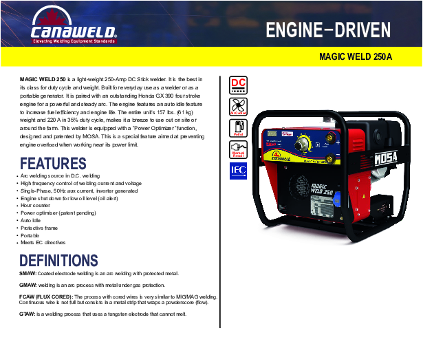 CWC1VN7070 - Mosa Generator Magic Weld 250Honda GX390 Four Stroke Engine