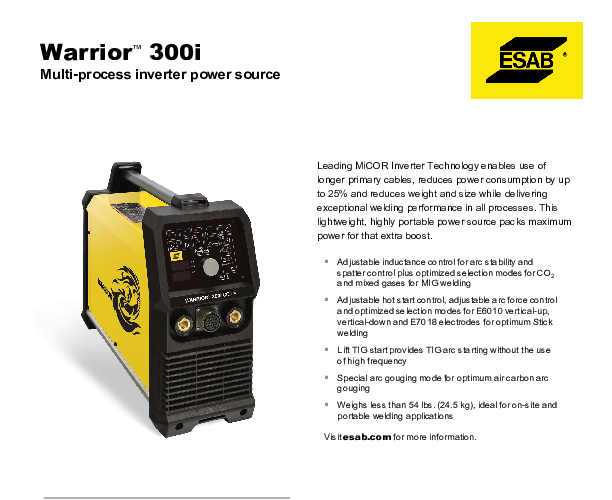 The Warrior 300i typically operates on 3-phase industrial power, covering ranges like 380V, 460V, and 575V depending on the specific model configuration.